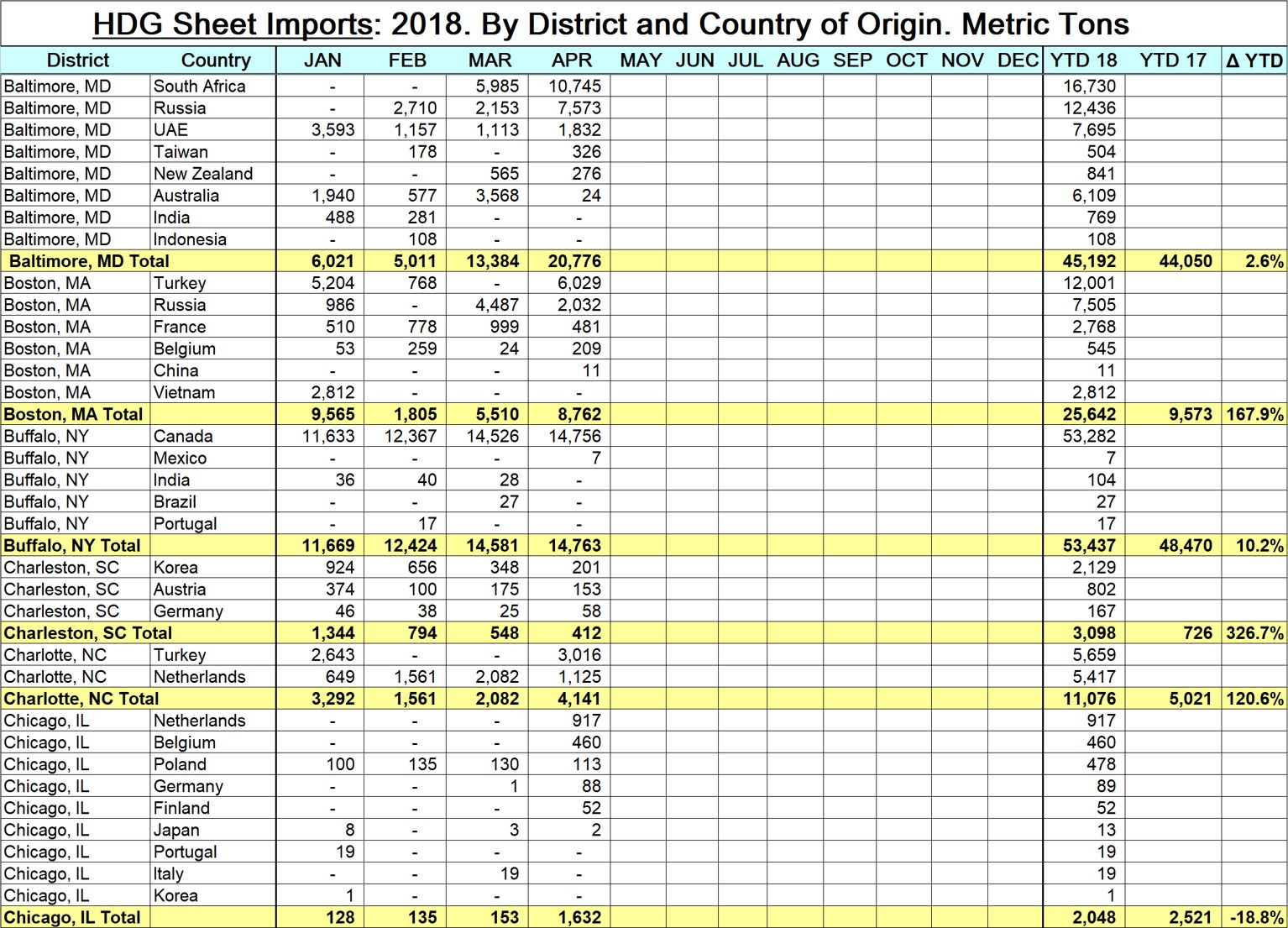 Premium members will find reports on our website that break down the import tonnage through April into the port of entry and country of origin in metric tons. Products analyzed in this way are HRC, CRC, HDG sheet, OMC sheet, CTL plate and coiled plate. This data set is large; therefore, we will make no attempt to provide a commentary. Each reader’s interest will be different and he or she simply needs to select one of the six products, then find the nearest port or ports of entry to see how much came into the region each month and from where. Monthly data is provided back to January 2015. It is clear from these detailed reports that the change in tonnage entering a particular district in many cases is completely different to the change in volume at the national level.