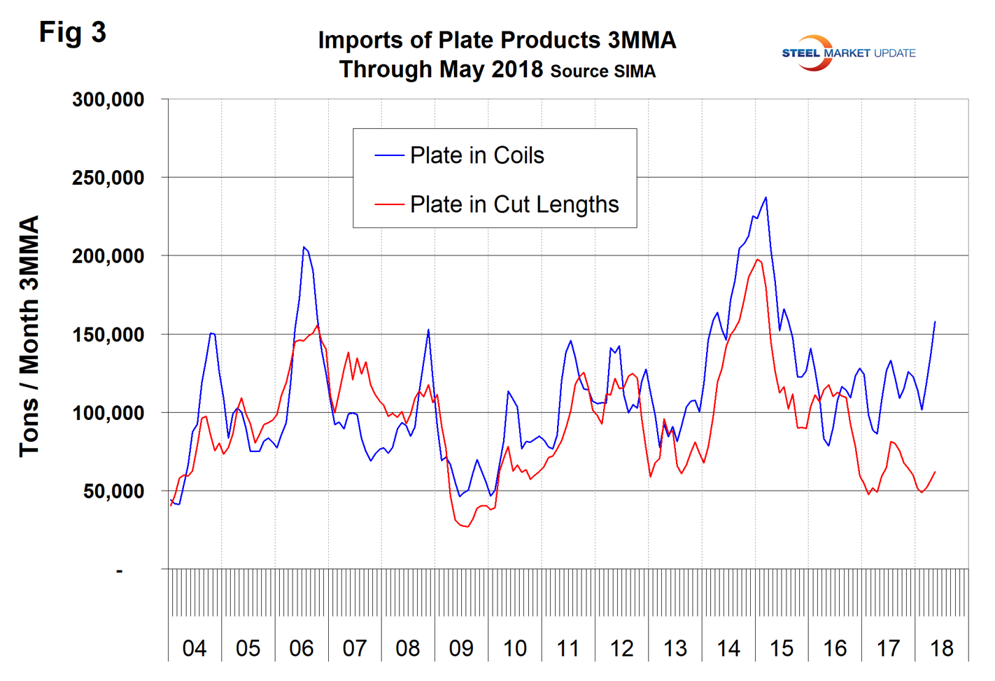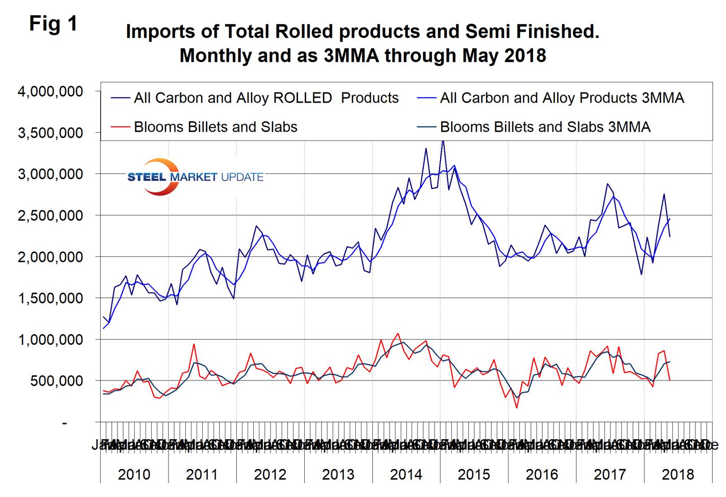 Figure 1 shows the tonnage of total rolled steel and semi-finished imports through May on both a 3MMA basis and on a monthly basis. In this June update, for the first time, we have included both measures on the same chart because they are currently moving in opposite directions to an unusual degree. The 3MMA is trending up and the monthly values are down significantly. The 3MMA of total rolled product import volume in July 2017 was 2,722,567 tons, the highest since May 2015. Imports declined every month on this basis through February 2018 when they reached 1,977,871 tons. This was the first time the figure dipped below two million tons since May 2016. The 3MMA of rolled product imports increased in March, April and May to 2,175,838 and 2,350,144 and 2,455,150 tons, respectively. Semi-finished imports also increased in March, April and May from February’s very low volume to the highest level since August last year on a 3MMA basis.
