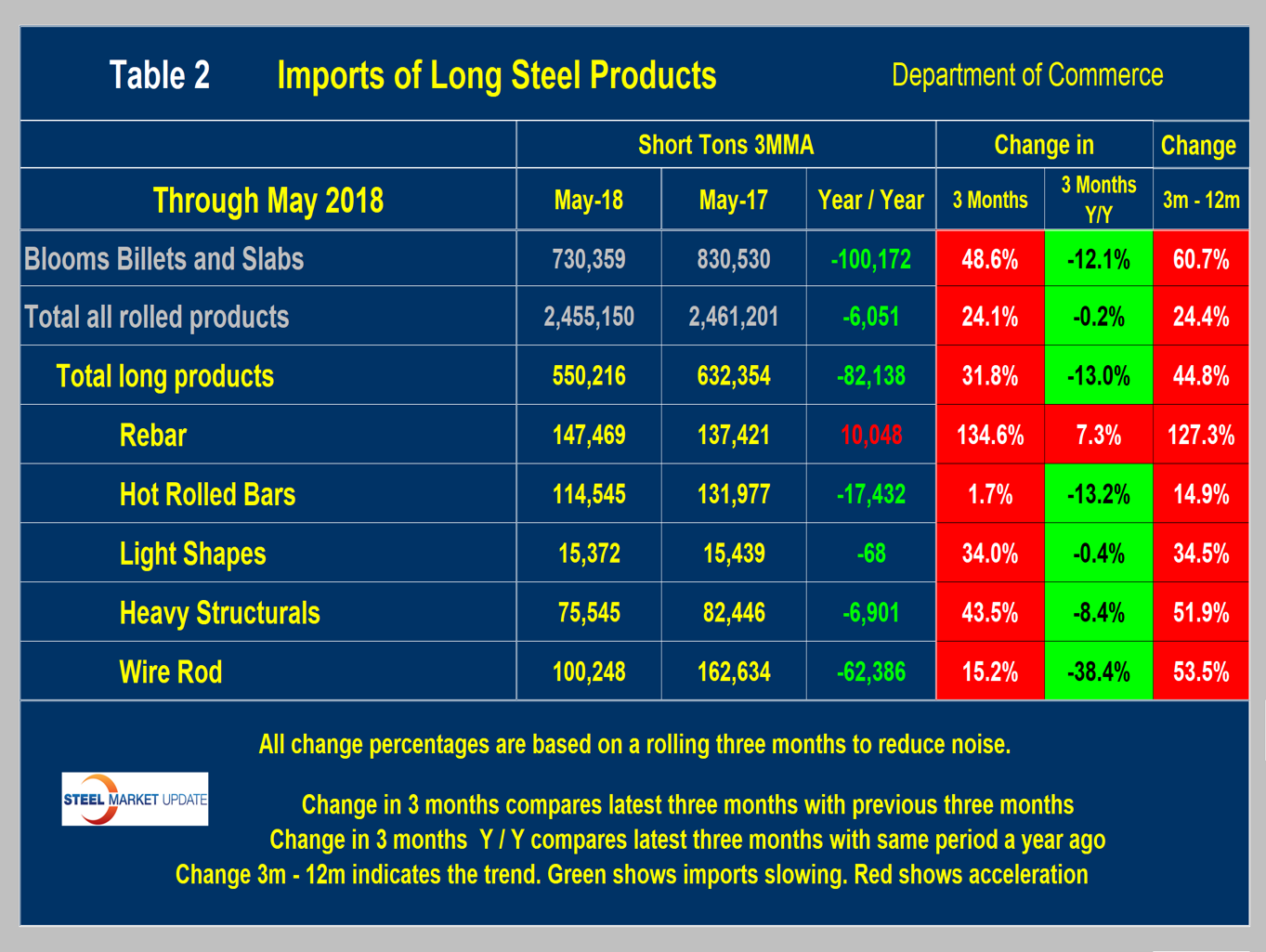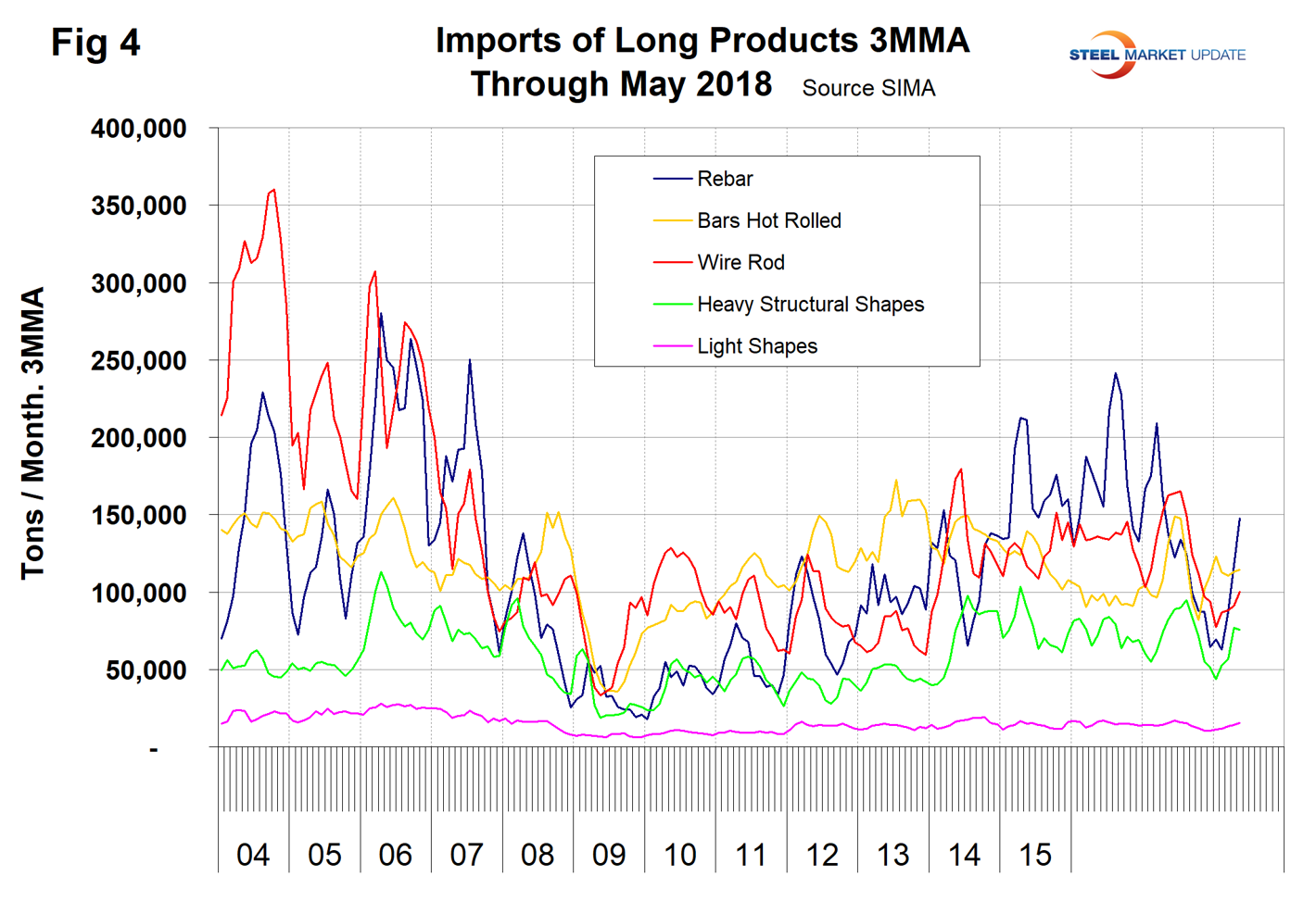 Table 2 shows the same analysis for long products where 3M/3M imports were up by 31.8 percent, led by rebar up 134.6 percent. Figure 4 shows the history of long product imports.
