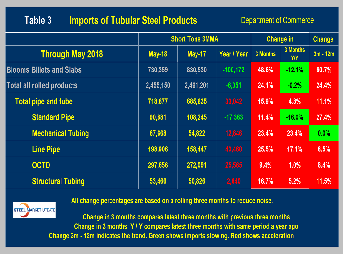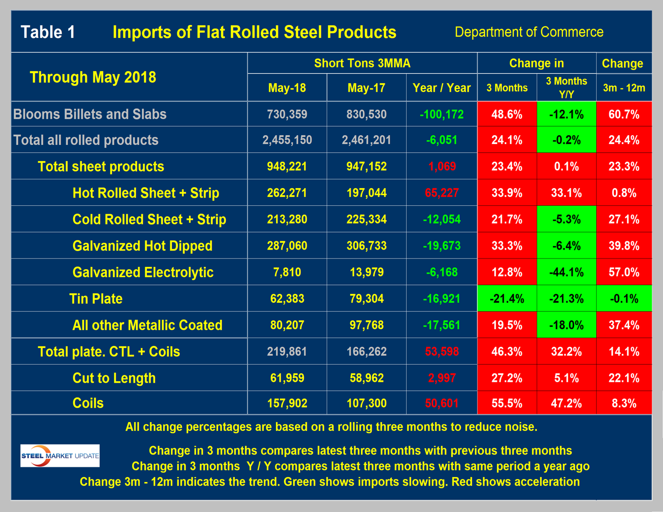 Total rolled steel product imports declined in May, but increased by 24.1 percent from March through May, compared with the prior three-month period.