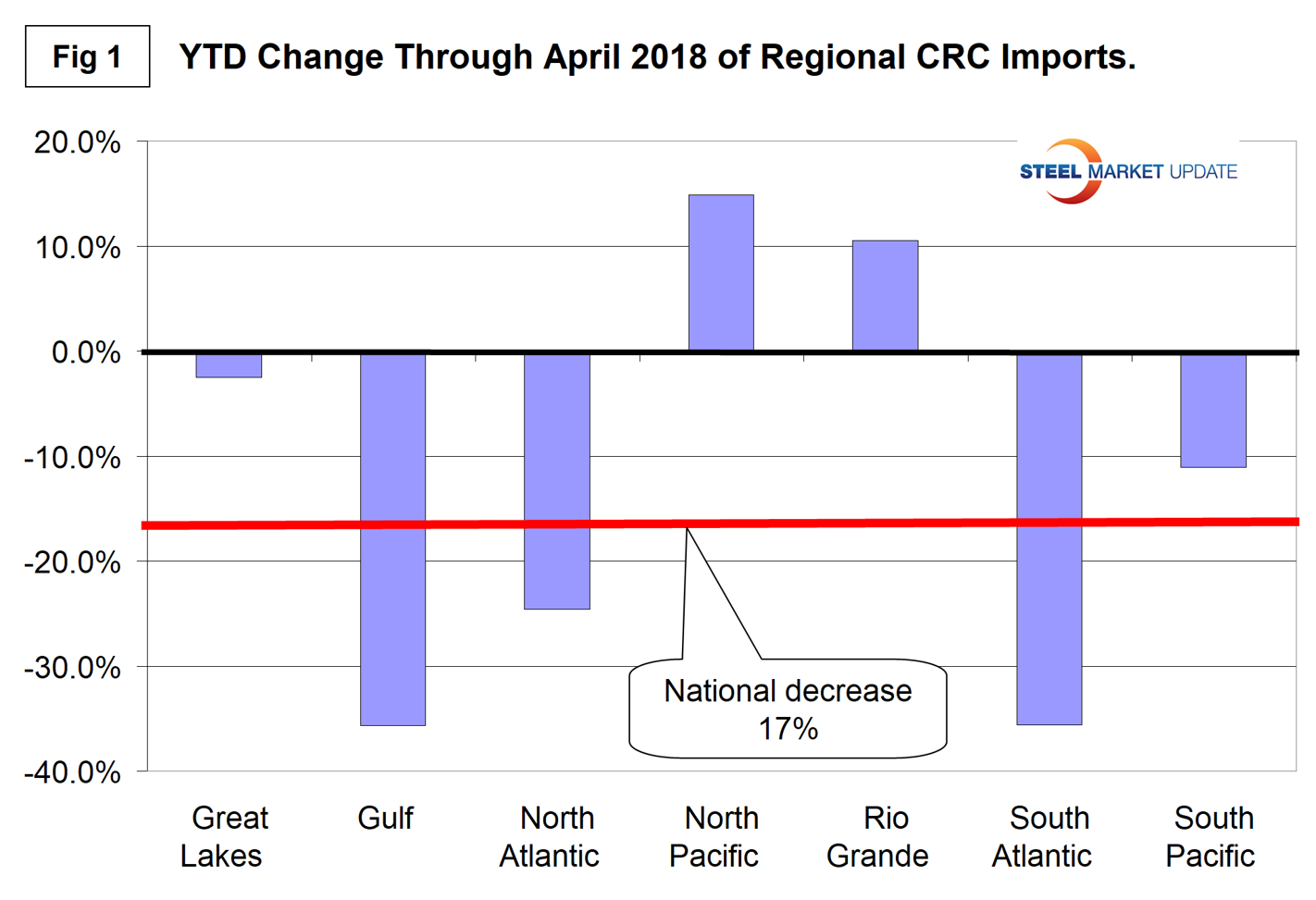 Figure 1 shows the year-to-date change in CRC imports for each of seven regions and the change at the national level. The North Pacific and Rio Grande have experienced increased volume, the Great Lakes region has about broken even and the other regions have had substantial decreases.