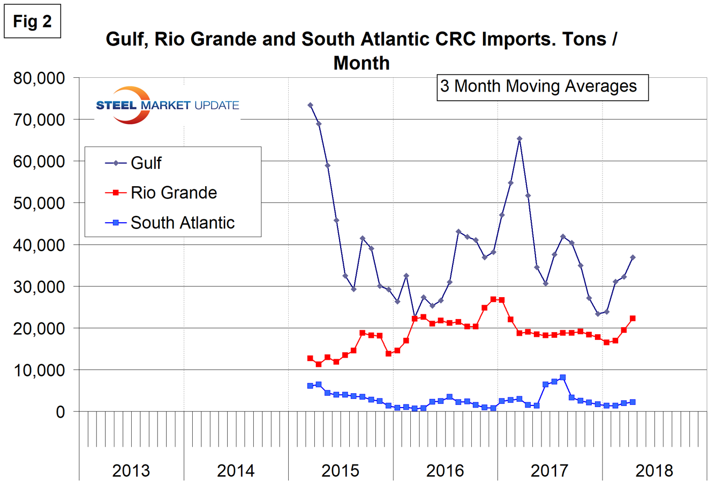 Imports into the Gulf have been very erratic with peaks in March 2015 and March 2017. Next time we publish, we will push this data back to March 2013. The Gulf currently has the highest volume, followed by the Great Lakes. Cold rolled imports coming across the Rio Grande and also into the South Atlantic have been fairly consistent for over three years.