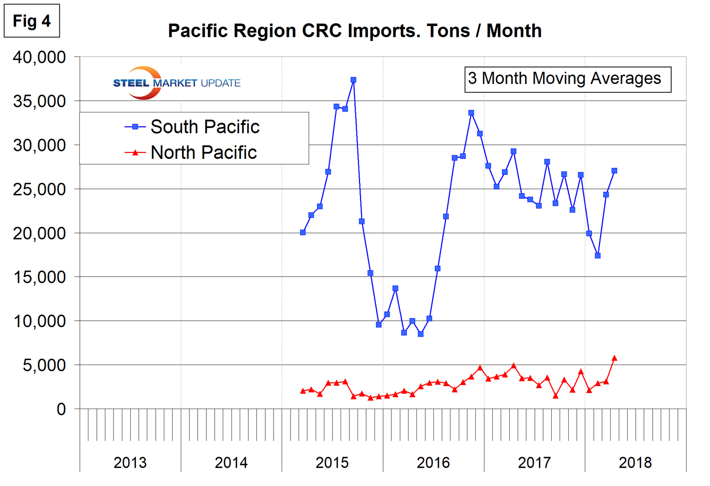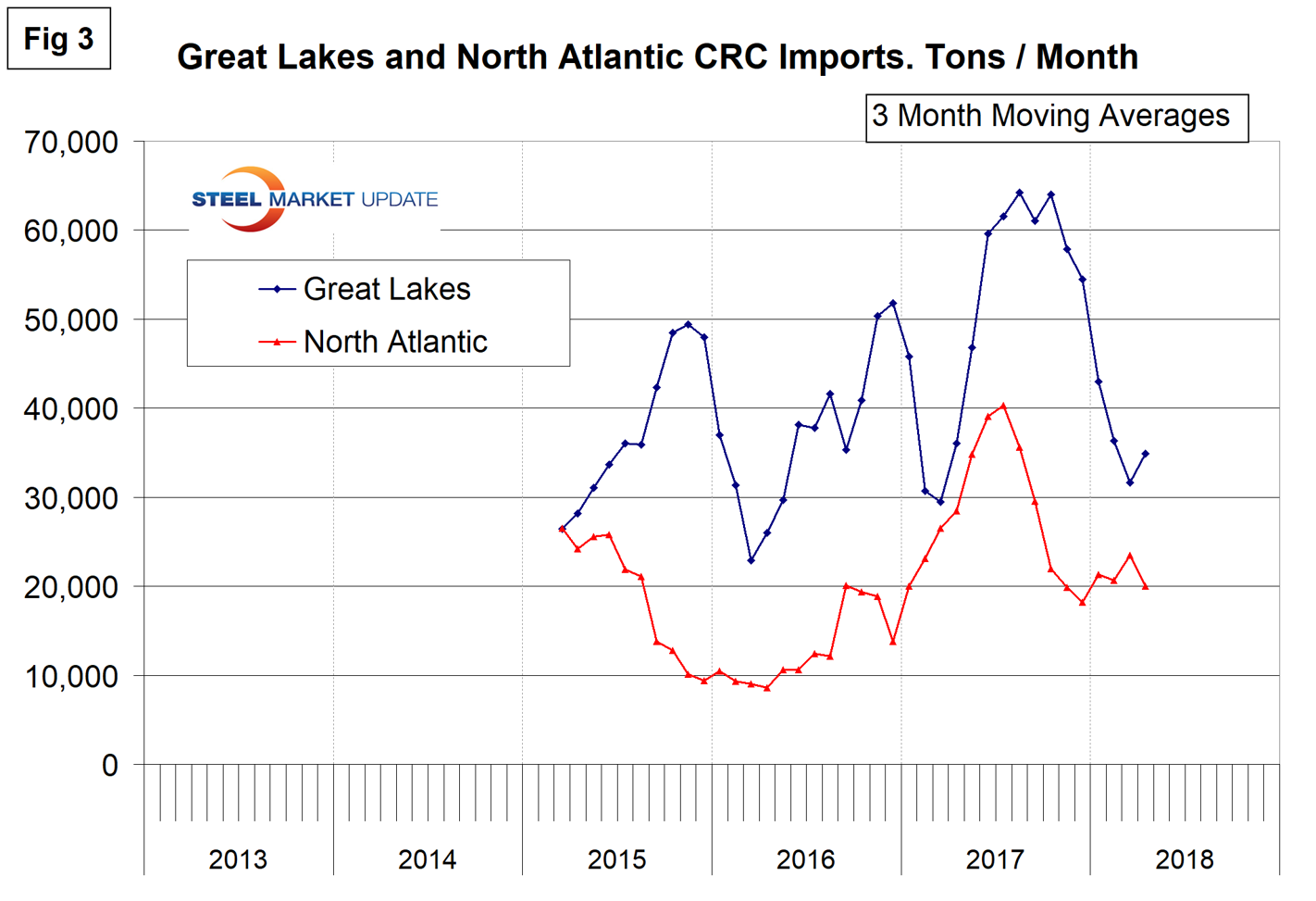 Figures 2, 3 and 4 show the history of CRC coil imports by region since March 2015 on a three-month moving average basis.