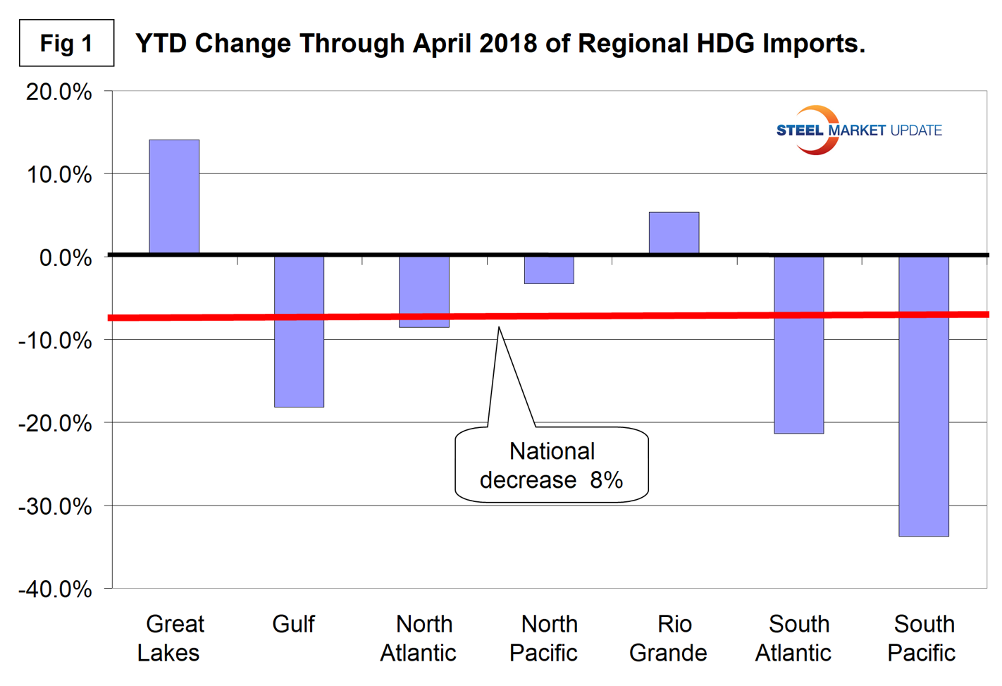 Imports of hot-dipped galvanized sheet into the U.S. as a whole declined by 8 percent year to date through April, but the Great Lakes region was up by 14.1 percent and the South Pacific was down by 33.8 percent.