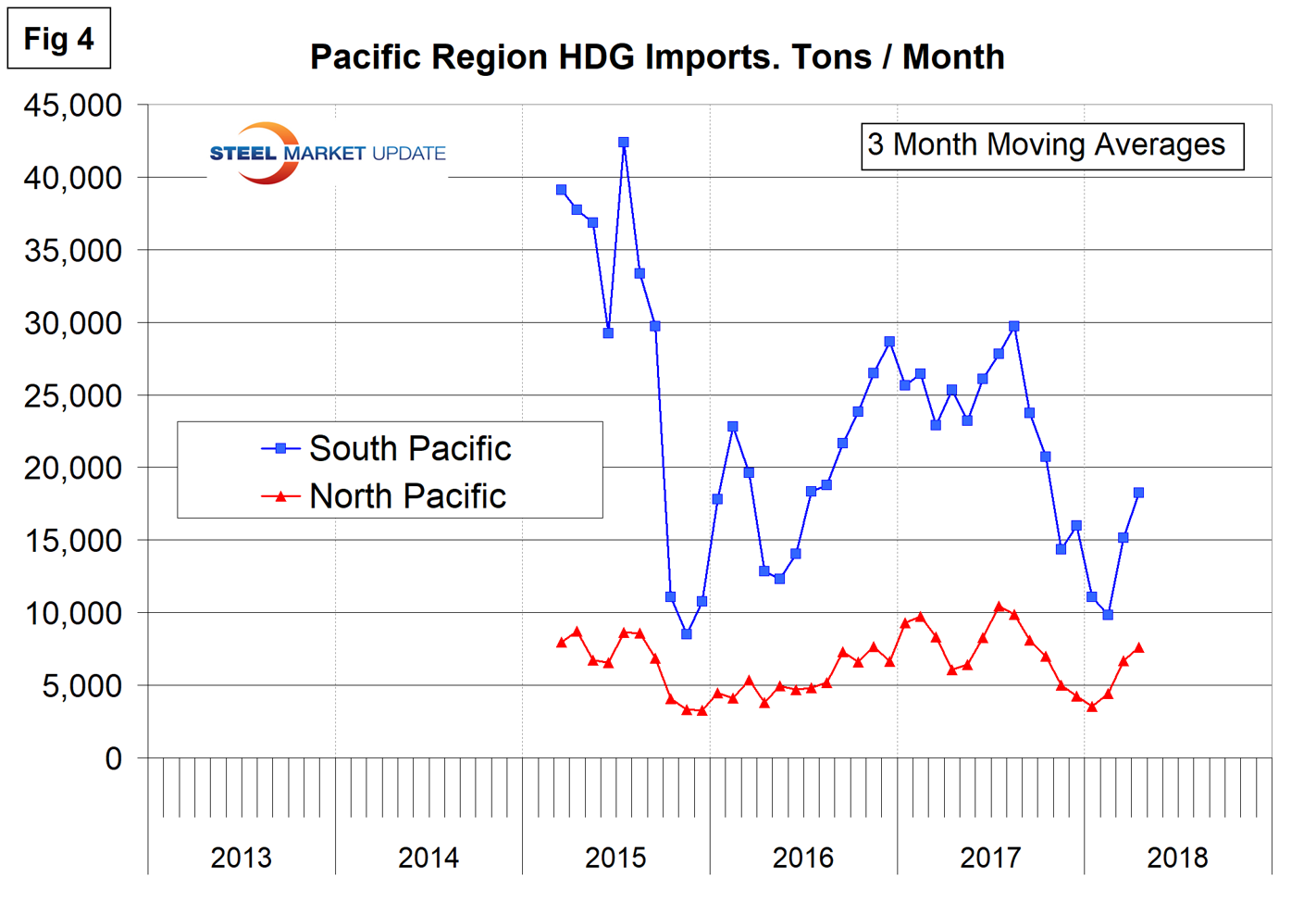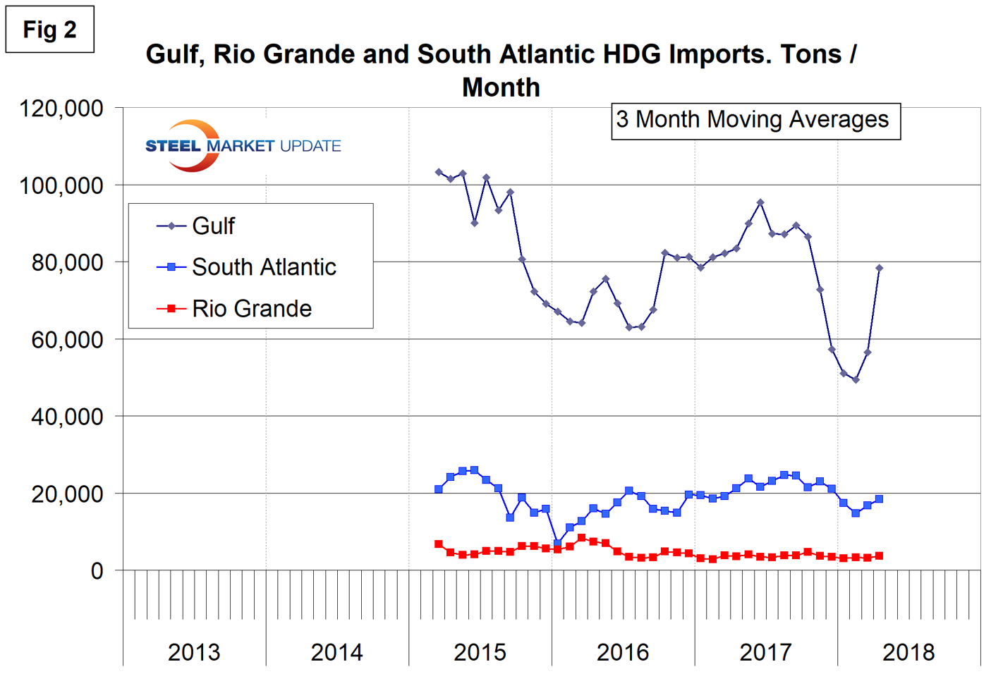 Figures 2, 3 and 4 show the history of HDG coil imports by region since March 2015 on a three-month moving average basis.