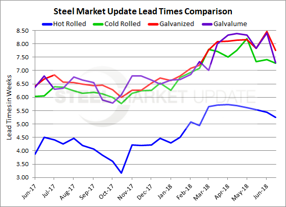 Lead times for coated steels, which have been the longest, shortened up considerably this month. The current lead time for galvanized is 7.76 weeks, down from 8.46 weeks, while Galvalume is at 7.29 weeks, down from 8.40 weeks in early June.