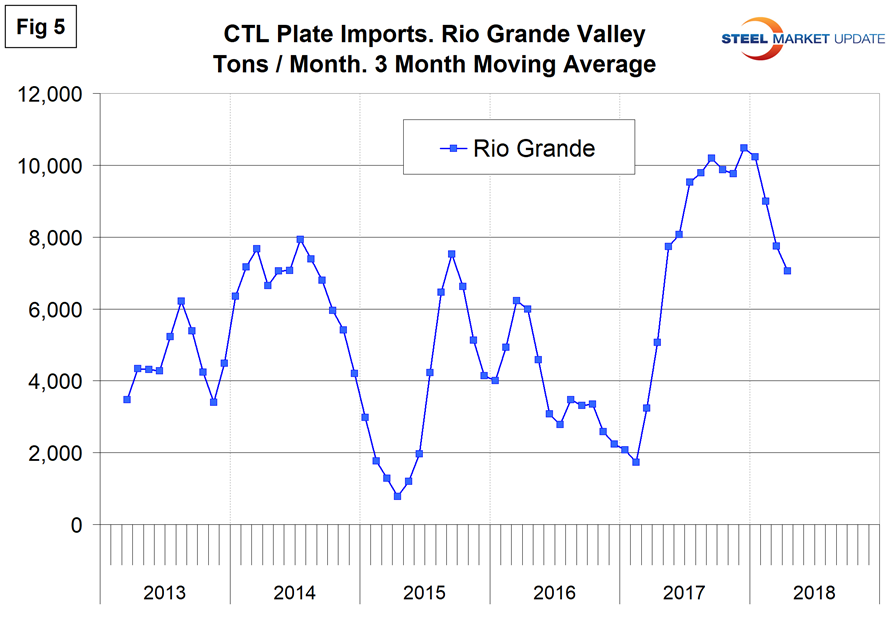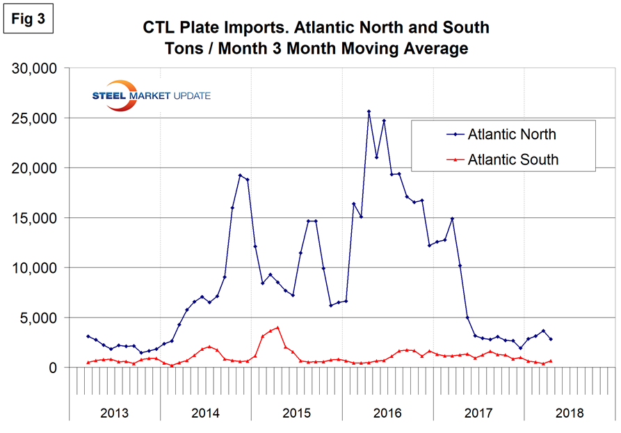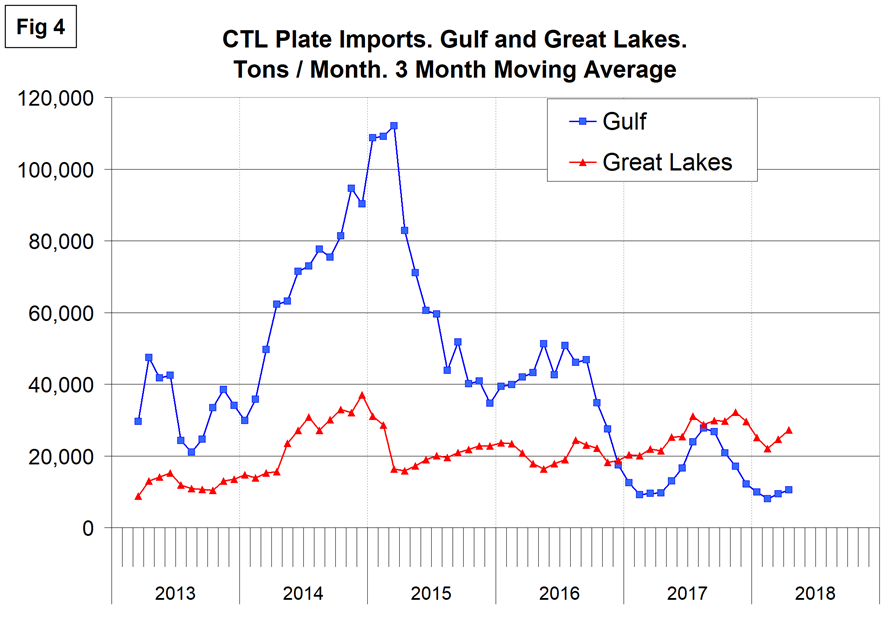 Figures 2, 3, 4 and 5 show the history of CTL plate imports by region since March 2013 on a three-month moving average basis.