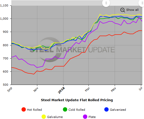 SMU Note: Below is a graphic showing our hot rolled, cold rolled, galvanized, Galvalume, and plate price history. This data is available here on our website with our interactive pricing tool. Note that plate prices are not yet available on our website, but we are in the process of adding that dataset. If you need help navigating the website or need to know your login information, contact us at info@SteelMarketUpdate.com or 800-432-3475.
