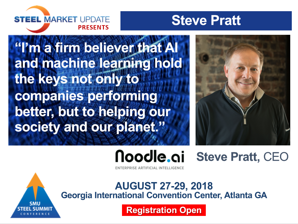 Artificial Intelligence is no longer just the stuff of science fiction. It has real-world application and is attracting real money from investors. Noodle.ai, a leading provider of enterprise AI applications, announced that it has raised more than $50 million to expand the company’s suite of applications. AI is one of the many topics to be explored at Steel Market Update’s upcoming Steel Summit Conference.