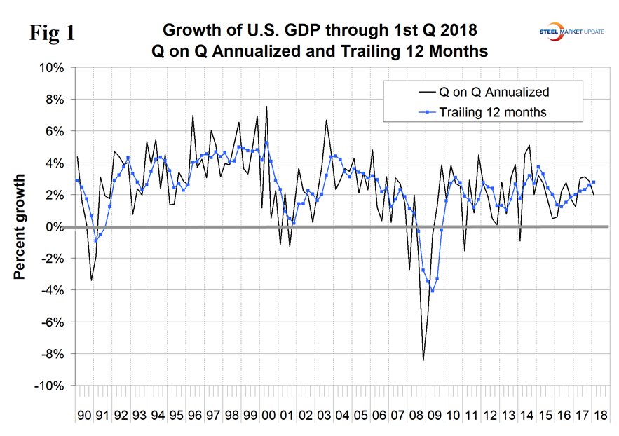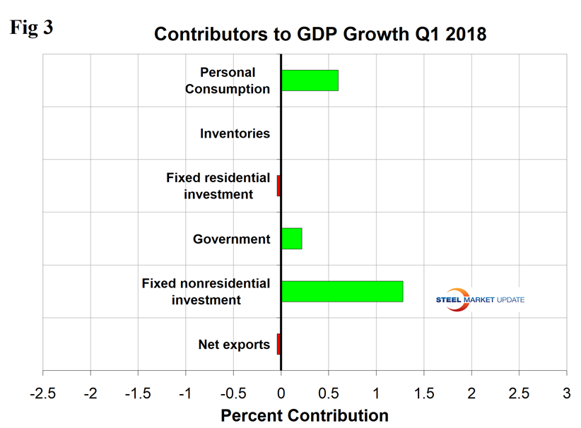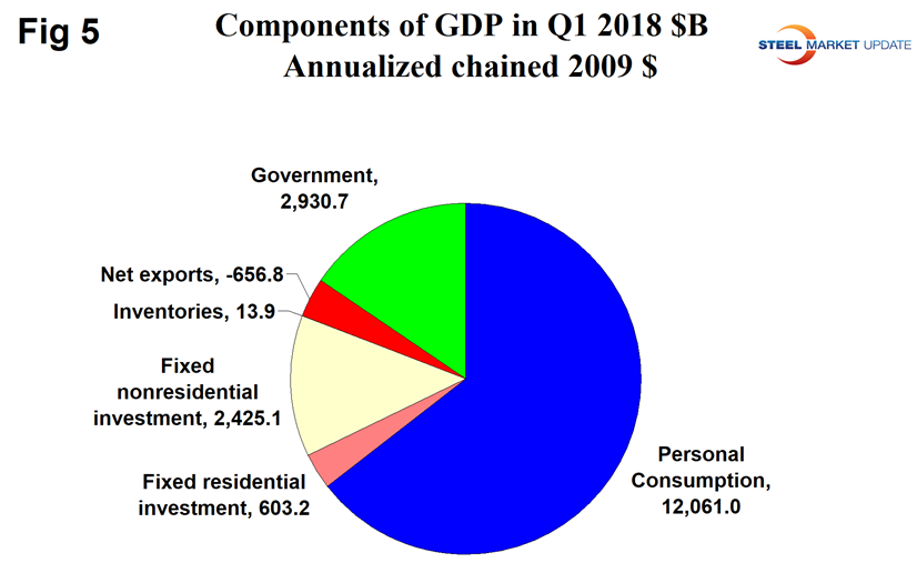 SMU Comment: This was a rather subdued result with the biggest change being a decline in personal consumption compared to Q4 2017. The trailing 12-month growth rate has improved for each of the last seven quarters and in Q1 reached 2.77 percent. This is high enough to stimulate future steel consumption, which requires a 2.2 percent growth to break even.
