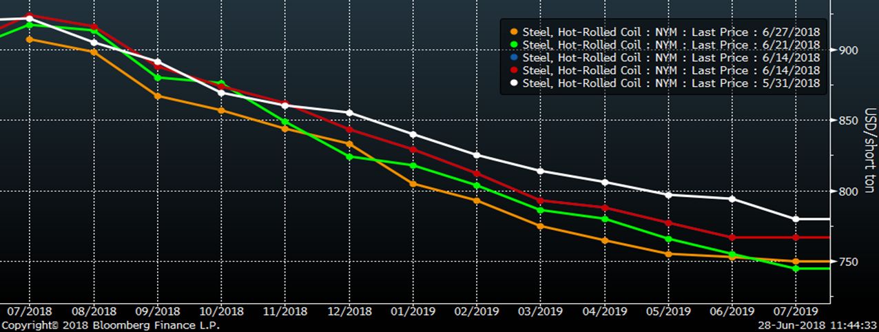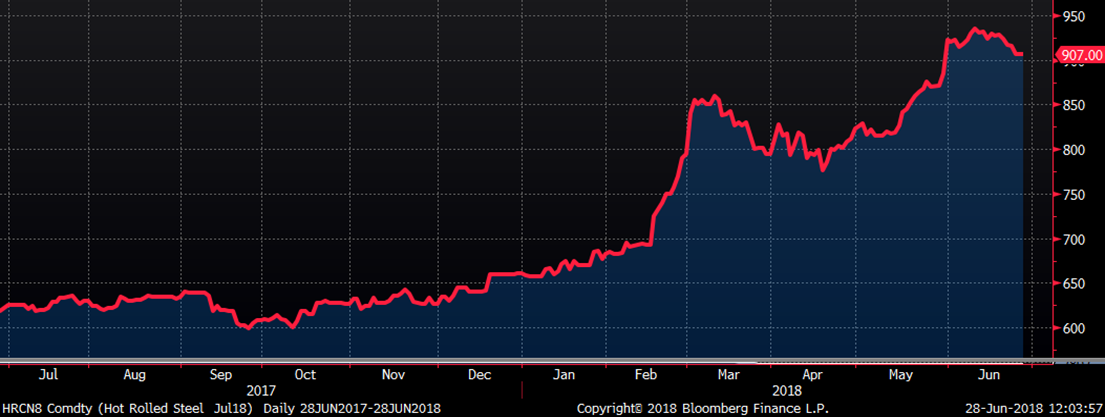 Despite the extensive media frenzy around trade and tariffs this week, futures prices have been little changed. Since the CME Midwest HRC futures rallied following the Trump administration’s removal of tariff exclusions for Canada, Europe and Mexico on May 31, the market has taken a breather with July trading at $907, down $10/st this week. Trade volume has plummeted with the Steel Success Strategies conference in New York this week, as well as the upcoming holiday week.