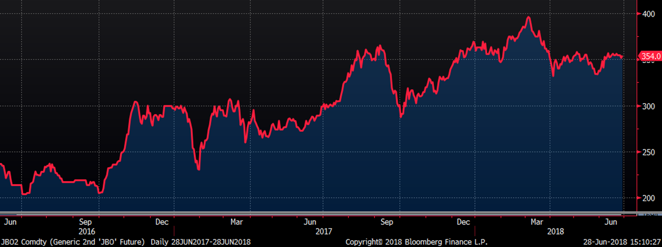 As prices have moved slightly lower over the last month, the shape of the curve has seen little change. The curve continues to maintain its downward slope with Q4 trading around $835/st and Q1 around $800.