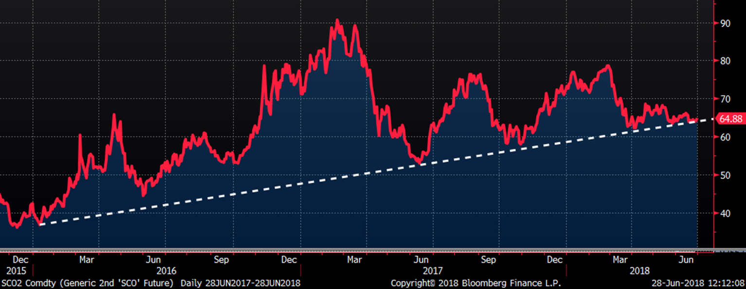 The 2nd month rolling SGX iron ore future continues to track the line from the uptrend that started in early 2016 after ore bottomed just below $40/mt. The trading range continues to tighten.