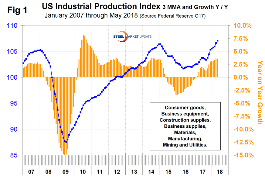 Figure 1 shows the IP index since January 2007 with the year-over-year growth. The three-month moving average (3MMA) of the year over year growth is shown by the brown bars in Figure 1. March 2017 was the first month of positive growth in the 3MMA since April 2015. Growth has steadily improved since September 2017. Manufacturing capacity utilization improved from 74.48 in January last year to 75.56 in May 2018, also on a 3MMA basis.