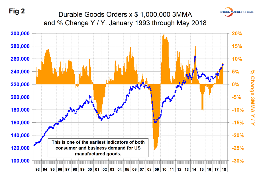 The U.S. Census Bureau announced on Thursday that new orders for manufactured durable goods in May increased by 0.4 percent on a 3MMA basis month over month and were up by 8.2 percent year over year. Figure 2 shows the 3MMA of monthly orders for durable goods since January 2010 and that the percent change year over year was the highest since September 2014.