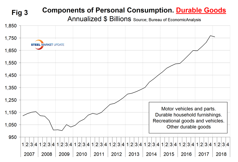 The third estimate of Q1 2018 GDP came in at 2.0 percent annualized growth, which was down from 2.86 percent in Q4 2017. A subcomponent of the quarterly data is durable goods, which is part of the personal consumption calculation. It therefore contains no military hardware or civil aircraft data. This is shown in Figure 3 and, presumably because of the exclusions just mentioned, looks nothing like Figure 2. The durable goods portion of GDP declined in Q1 2018, but the long-term trend is still very positive.