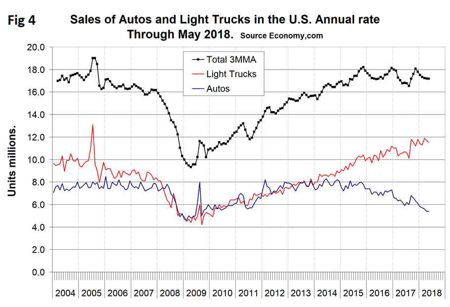 Our past reports have included auto assembly data for the U.S., Canada and Mexico, but that source has dried up, so until we find a replacement we are reporting on U.S. auto sales. Another complication is that effective April 2018, GM no longer reported their sales results. Automobile sales have trended down slightly in the last 2 ½ years, but in May were up by 0.6 percent year over year. Sales are still strong on a historical basis (Figure 4). Consumer preference for light trucks, which includes SUVs and crossovers is still increasing.