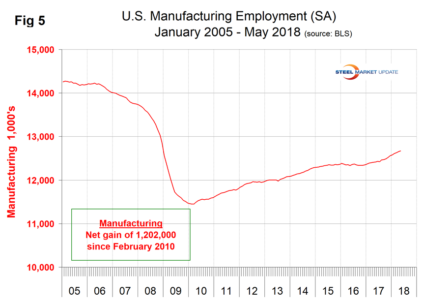 Economic indicators of manufacturing activity continue to look favorable for the rest of 2018. This report summarizes seven data sources that describe the state of manufacturing in the United States. We have reported on most of these separately in our Steel Market Update publications and therefore will be brief in this summary. We don’t expect these data sources to all point in the same direction. Our intent in summarizing them in one document is to provide a consensus of the state of this critical steel consuming sector. Based on American Iron and Steel Institute estimates of steel mill shipments by market classification, almost 50 percent of the steel consumed in the U.S. is manufacturing-oriented. This breaks down to about 27 percent in ground transportation including infrastructure, 9 percent in machinery and equipment, 5 percent in appliances, 4 percent in defense and about 4 percent in containers.