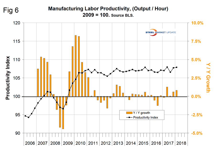The Bureau of Labor Statistics reported that in Q1 2018, manufacturing productivity improved by 0.8 percent year over year (Figure 6). Productivity growth was erratic in 2017, but there has been a gradual improvement for three years.