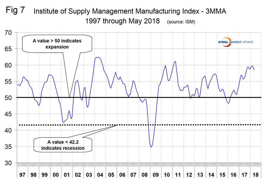 The Institute for Supply Management’s Manufacturing Index is a diffusion index. ISM states: “Diffusion indexes have the properties of leading indicators and are convenient summary measures showing the prevailing direction of change and the scope of change. An index value above 50 percent indicates that the manufacturing economy is generally expanding; below 50 percent indicates the opposite.” Figure 7 shows the 3MMA of the ISM index from January 1997 through May 2018 with an improving trend since January 2016. In May, the 3MMA of the index at 58.43 was down by 1.3 from March, but still historically high.