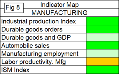 SMU Comment: Last month, we introduced an indicator map for manufacturing that is shown as Figure 8. There are no clouds on the horizon. The weakest indicator of the seven is the increase in labor productivity, which we find surprising considering all we read about AI and automation.