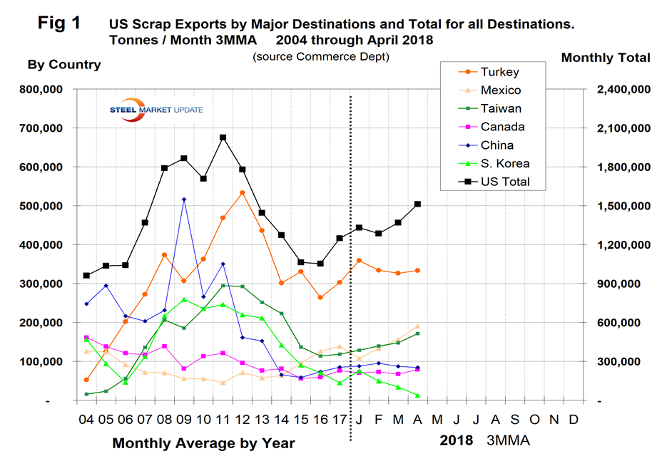 U.S. scrap exports expanded by 31 percent in the first four months of 2018, while total global scrap trade has been trending up since Q1 2016.