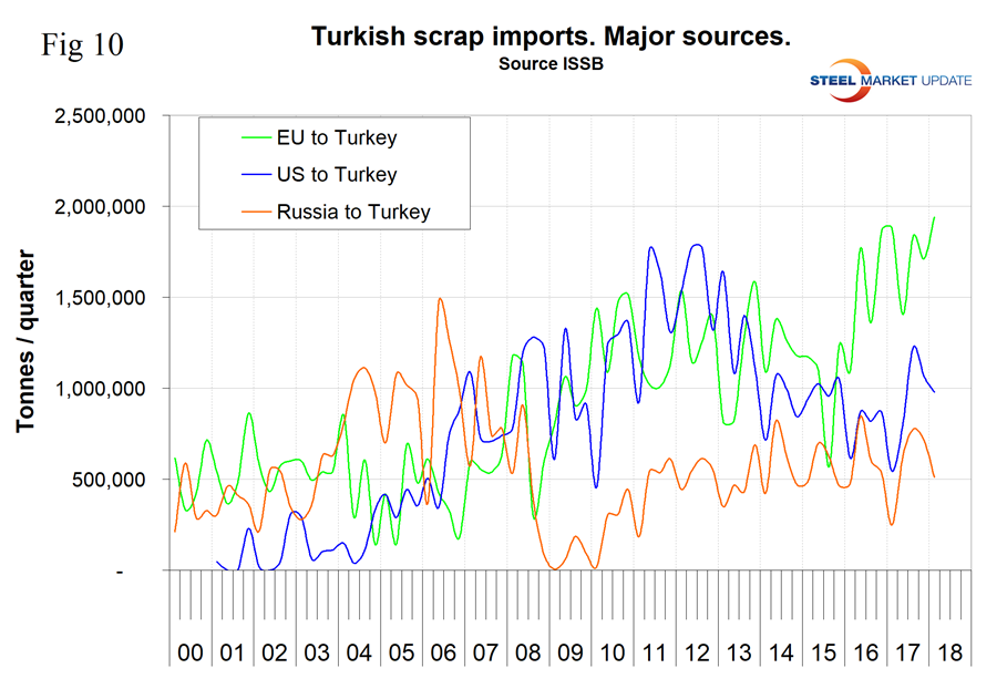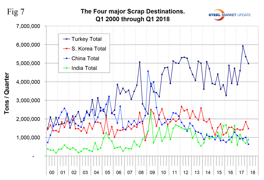 Figure 7 shows the tonnage received by the four major importing nations. Turkey is by far the largest global scrap buyer with a tonnage totaling more than the other three combined. In Q1 2018, Turkey took in 27.9 percent of the global total.