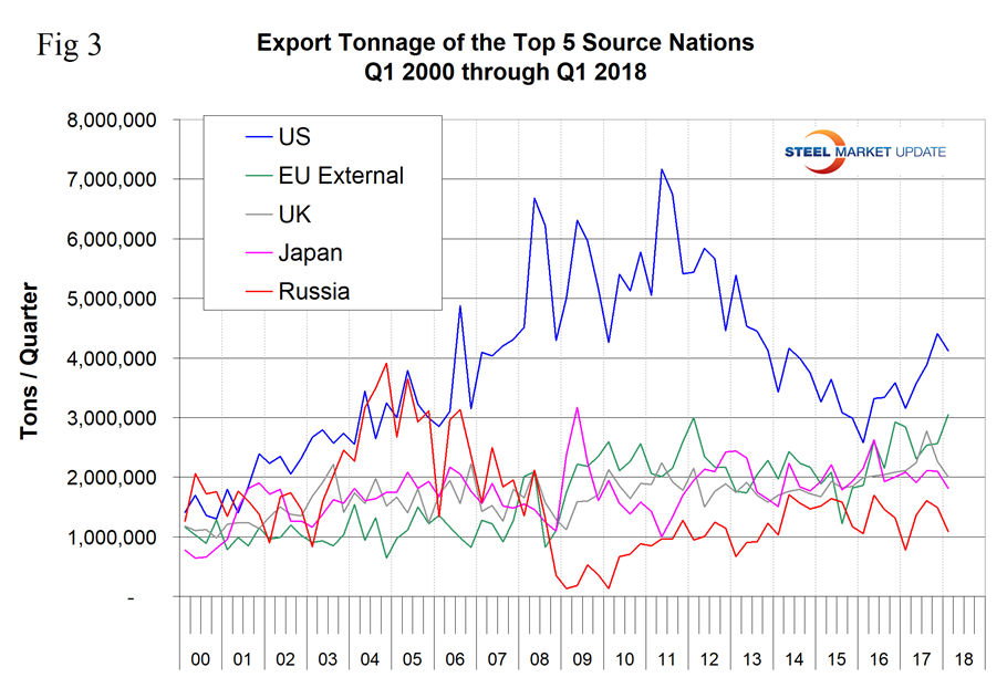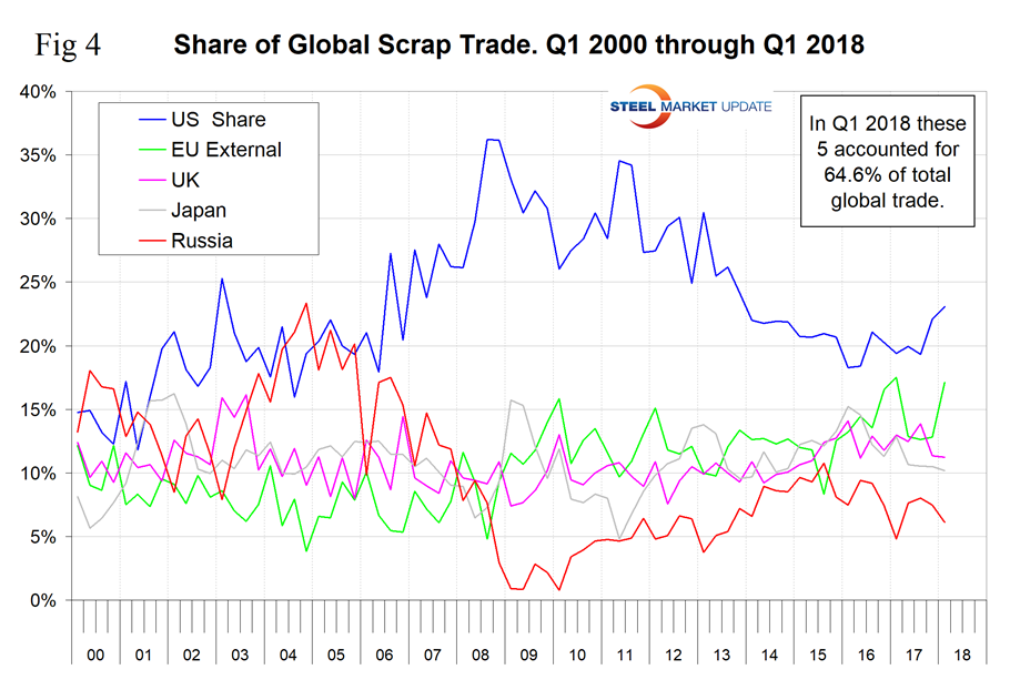 In our analysis of global scrap trade, we have excluded scrap that moved within the EU from the global total. Figures 2 and 3 show the total tonnage of global trade since Q1 2000 and the volume of the top five suppliers. These five are the U.S., the EU, the UK, Japan and Russia, and they accounted for 68.6 percent of the total in Q1 2018.