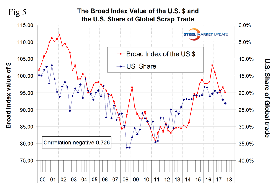 Second, in the past, a strong U.S. dollar attracted steel imports from the scrap-to-steel converters in many countries like Turkey. Subsequently, their utilization rates increased dramatically, and more imported scrap was required, as you reported. Further, they had no problem buying U.S. scrap as their conversion costs were in their country’s weaker currency. This resulted in a decrease in U.S. steel prices and steel utilization rates, which subsequently reduced U.S. scrap demand. This also redirected scrap flows to East Coast ports from normal steel plant supply lines because scrappies could get a better price on the docks.