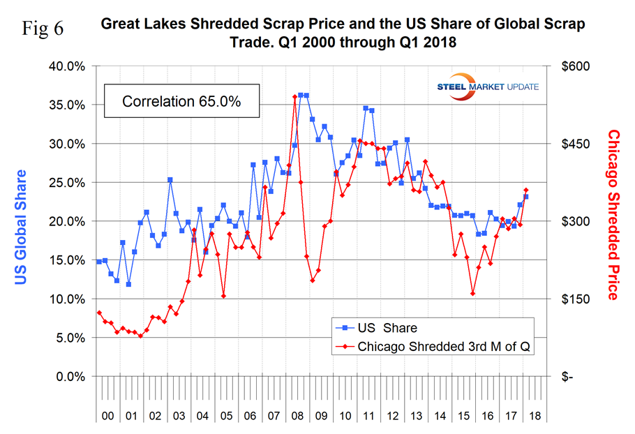Figure 5 shows the negative correlation of 72.6 percent between the Broad Index value of the U.S. dollar and the U.S. share of global trade. There is also a correlation between the U.S. global share and the U.S. domestic scrap price. The result is shown in Figure 6 with a correlation of 65.0 percent. The fact that our export share increases as our domestic price increases might seem backwards at first glance. However, scrap is a global commodity and this would seem to support the view that the domestic price is driven more by export volume than by domestic demand.