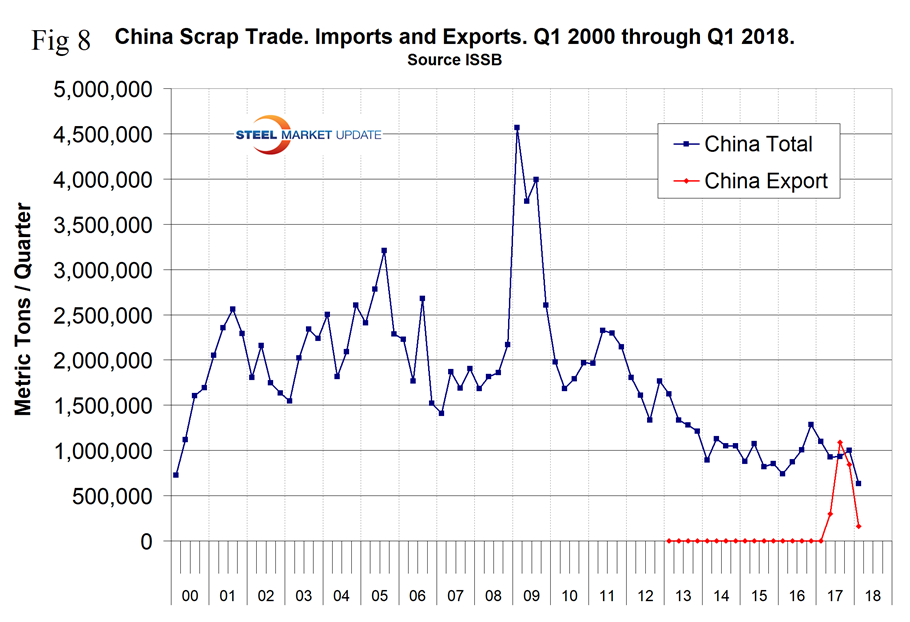 The spike in China scrap imports (approximately 13 million metric tons) was a result of U.S. prices being under $150 per ton. It was a result of the 2008 market crash and utilization rates hitting unforeseen lows. The Chinese changed their BOF scrap charge rates to approximately 20 percent from the previous 3-5 percent.
