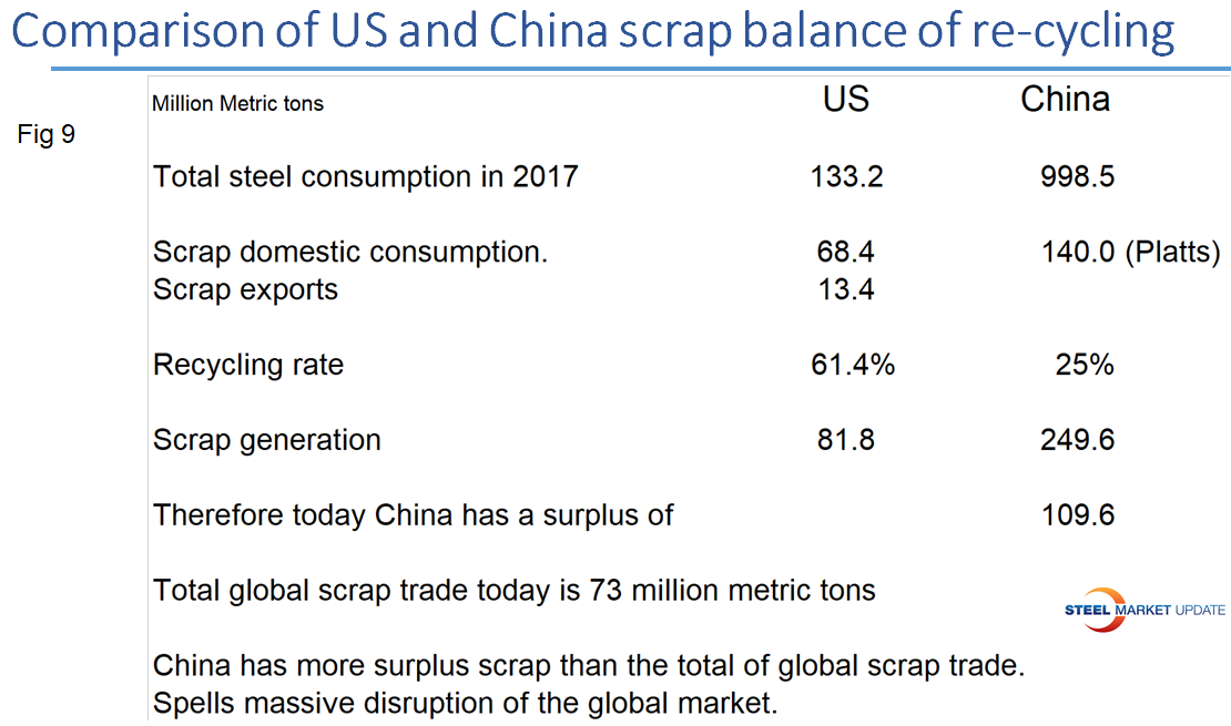 Since the early 2000s, I have regularly informed conference attendees that China will control global scrap markets. There are no reasons for them to import scrap. Based on yield losses generated from their flat carbon steel processing, the amount was sufficient to satisfy their requirements. Recently, they have upped the percentage of purchased scrap to about 9 percent from 3-5 percent in an attempt to absorb more scrap. It’s NOT working, and we can definitely expect large increases in scrap exports in the near future as they perfect their logistics.