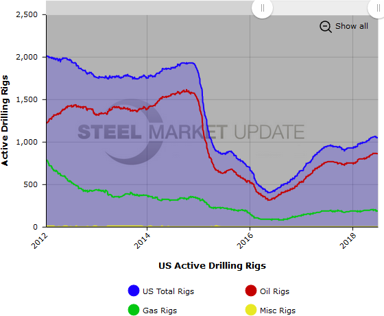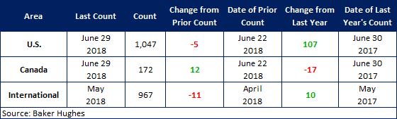 The U.S. rig count, an indicator of oil country tubular goods demand, fell this week, according to June 28 data from oilfield services company Baker Hughes. The number of active U.S. drill rigs fell by 5 to 1,047 rigs, with oil rigs down 4 to 858 rigs, gas rigs down 1 to 187 rigs, and miscellaneous rigs unchanged at 2 rigs. Compared to this time last year, the 1,047 count is up 107 rigs, with oil rigs up 102, gas rigs up 3 and miscellaneous rigs up 2. See the first graph below for a history of active U.S. rig counts.