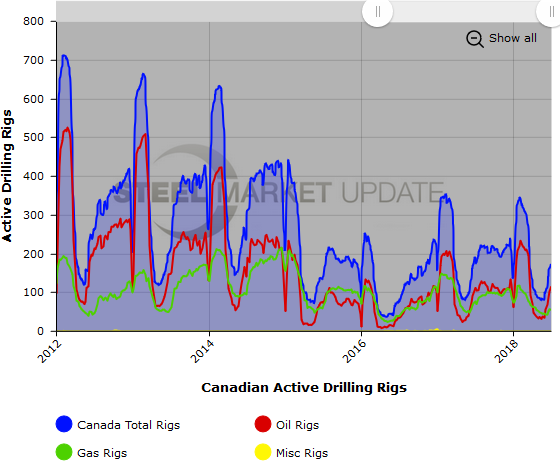 The Canadian rig count rose by 12 to 172 rigs, with oil rigs up 14 to 117 rigs, gas rigs down 2 to 55 rigs, and miscellaneous rigs unchanged at 0. Compared to last year, the 172 count is down 17 rigs, with oil rigs up 5, gas rigs down 22, and miscellaneous rigs unchanged. See the second graph below for a history of active Canadian rig counts.