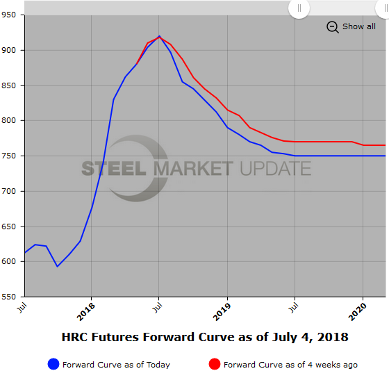 During the holiday week in the U.S., the HR futures markets have been thin, especially on the buy side of the market. We have seen lower prices trading in both Q3’18 and Q4’18 in modest volumes. The Q4’18 value was $841/ST for Q4’18 on June 29 versus $811/ST we traded earlier today, which reflects a fairly steep price drop in less than a week.