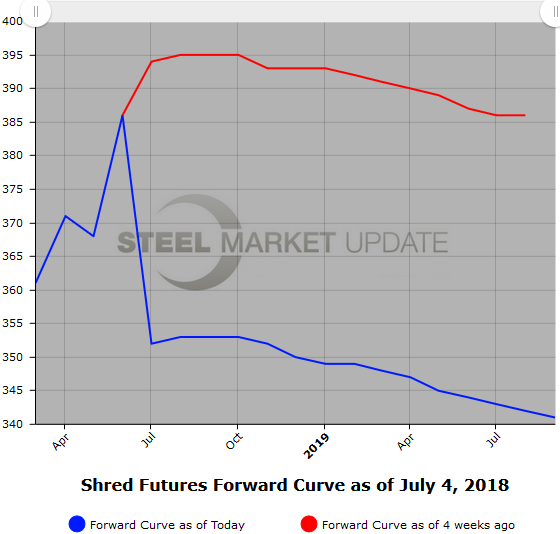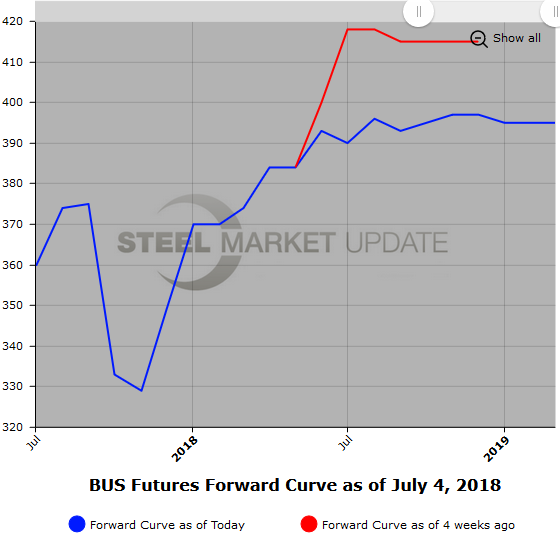 For prime scrap futures (BUS), the curve has remained relatively flat with $395/$405 per GT covering the latter half of 2018. Market participants have been expecting sideways to slightly higher negotiated prices for July. (June CME settlement $392.73/GT)