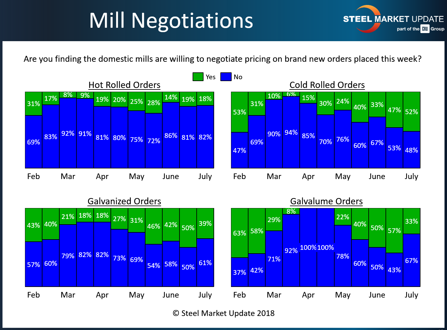 By market segment, 18 percent of hot rolled buyers said they have found mills willing to negotiate, up from 14 percent one month ago. Most, 82 percent, said the hot rolled mills are still standing firm.