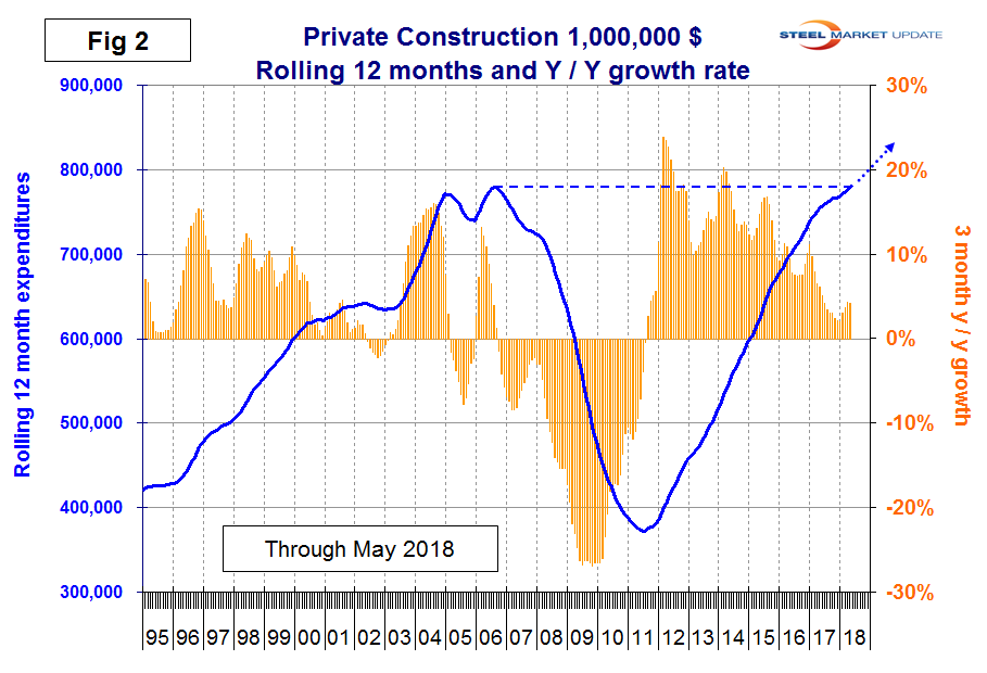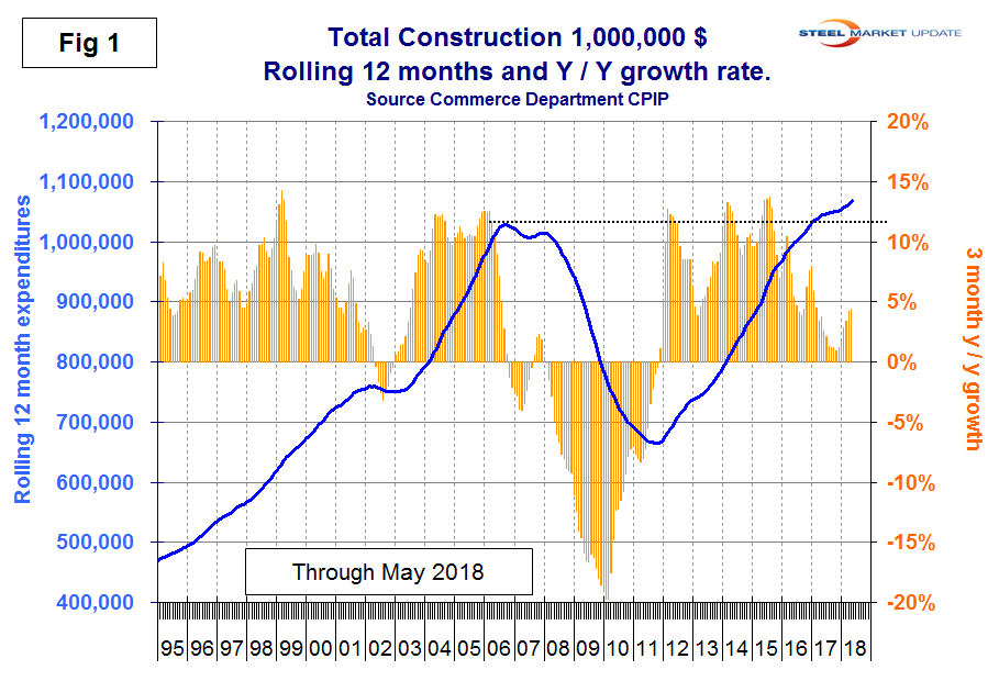 Construction spending has accelerated for six straight months, according to Steel Market Update’s latest analysis of Commerce Department data. Growth of total construction expenditures on a rolling three-month basis year over year increased from 0.9 percent in November 2017 to 4.4 percent in May 2018.