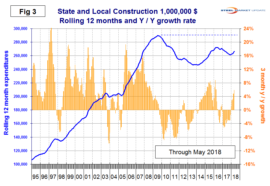 S&L work expanded by 5.9 percent in the rolling three months through May year over year with positive momentum. However, January through May were the first months with positive growth since 2016 (Table 3). The improvement was driven by nonresidential buildings and infrastructure, both of which are included in the S&L data. Table 3 shows that S&L nonresidential buildings expanded by 5.4 percent in three months through May, which was the best result since March last year. Educational buildings are by far the largest subsector of S&L nonresidential at $7.074 billion in May and experienced a 1.9 percent positive growth on a rolling three months basis with positive momentum. Figure 3 shows the history of total S&L expenditures and that a full recovery to the pre-recession level of expenditures probably won’t be achieved until sometime in the next decade.