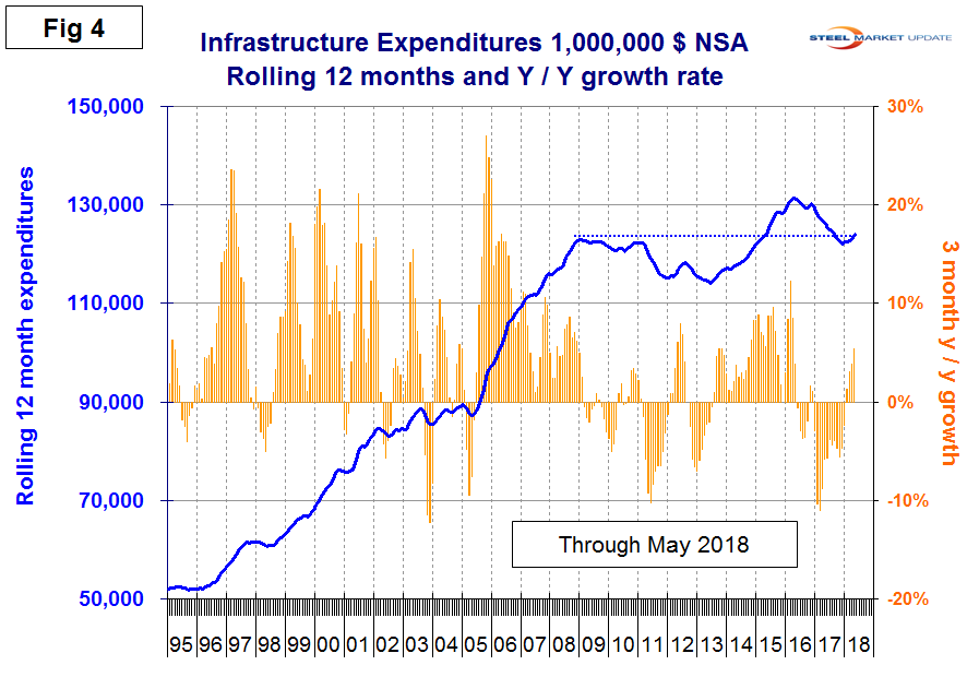 Figure 4 shows the history of infrastructure expenditures and the year-over-year growth rate.