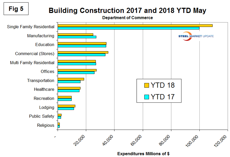 Figure 5 compares year-to-date expenditures for building construction for 2017 and 2018. Single-family residential is dominant, and in the 12 months of 2017 totaled $264.5 billion, up from $242.5 billion in 2016. It seems likely that the 2018 tax bill, by its reduction in the deductibility of mortgage interest and local taxes, will negatively affect single-family home construction.