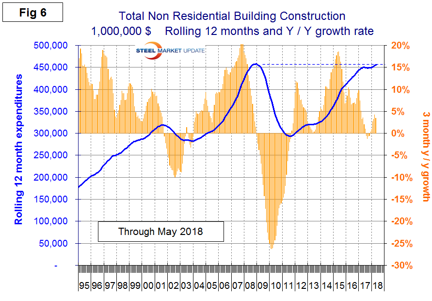 Figure 6 shows total expenditures and growth of nonresidential building construction. Growth slowed in January through July last year, went negative in August through October, then became increasingly positive in November through May 2018.