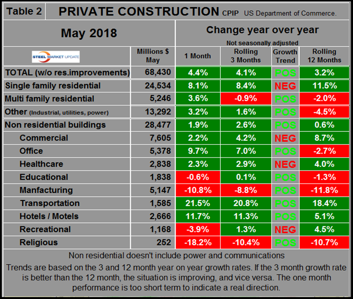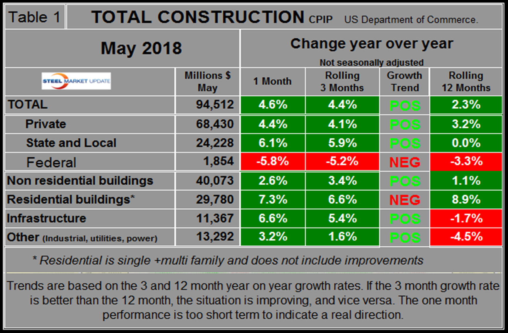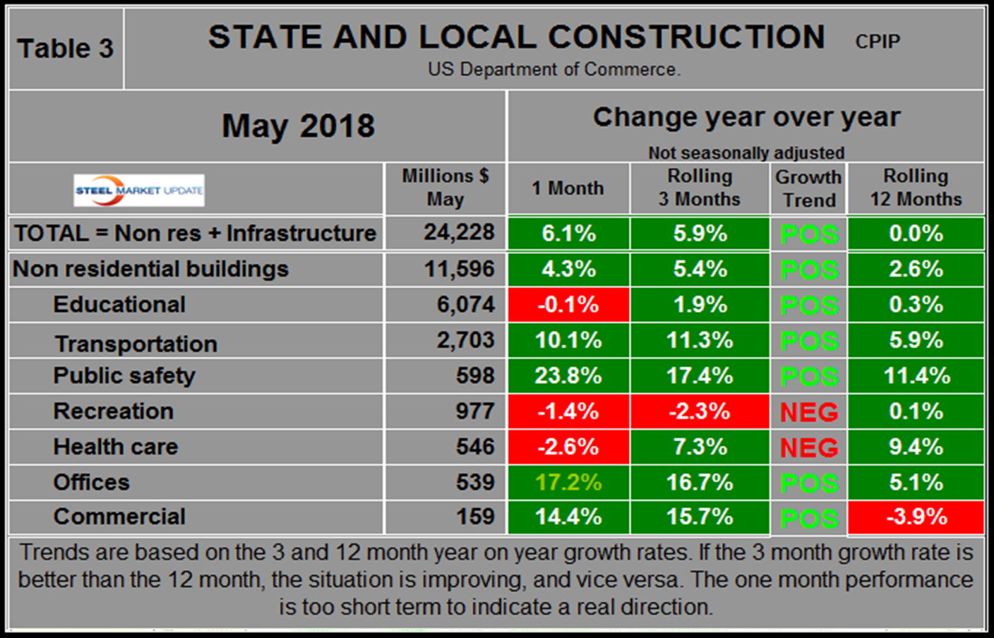 The official CPIP press release gives no appreciation of trends on a historical basis and merely compares the current month with the previous one on a seasonally adjusted basis. The background data is provided as both seasonally adjusted and non-adjusted. The detail is hidden in the published tables, which SMU tracks and dissects to provide a long-term perspective. Our intent is to provide a route map for those subscribers who are dependent on this industry to “follow the money.” This is a very broad and complex subject, therefore to make this monthly write-up more comprehensible, we are keeping the information format as consistent as possible. In our opinion, the absolute value of the dollar expenditures presented are of little interest. What we are after is the magnitude of growth or contraction of the various sectors. In the SMU analysis, we consider only the non-seasonally adjusted data. We eliminate seasonal effects by comparing rolling three-month expenditures year over year. CPIP data also includes the category of residential improvements, which we have removed from our analysis because such expenditures are minor consumers of steel.