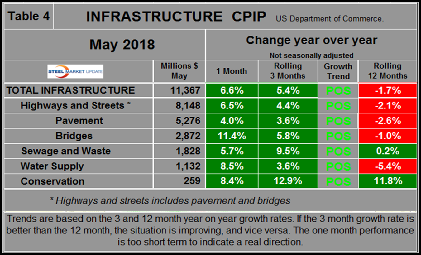 Infrastructure expenditures peaked in early 2016 and declined through 2017 before beginning a recovery in 2018. May had a 5.4 percent growth rate. Highways and streets including pavement and bridges account for about two-thirds of total infrastructure expenditures. Highway pavement is the main subcomponent of highways and streets and saw 3.6 percent growth in three months through May. Bridge expenditures have expanded every month this year, improving to a 5.8 percent growth rate in May (Table 4).