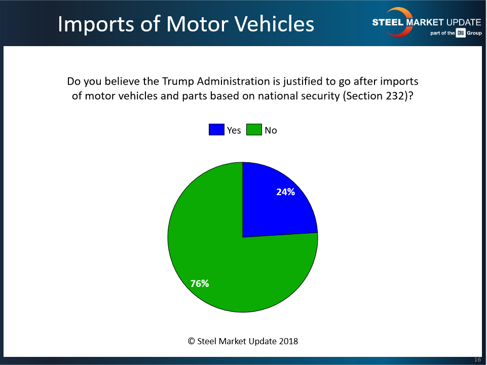 Are imports of motor vehicles and auto parts a threat to the security of the United States? More than three out of four respondents to last week’s Steel Market Update market trends questionnaire say no.