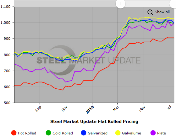 SMU Note: Below is a graphic showing our hot rolled, cold rolled, galvanized, Galvalume, and plate price history. This data is available here on our website with our interactive pricing tool. Note that plate prices are not yet available on our website, but we are in the process of adding that dataset. If you need help navigating the website or need to know your login information, contact us at info@SteelMarketUpdate.com or 800-432-3475.