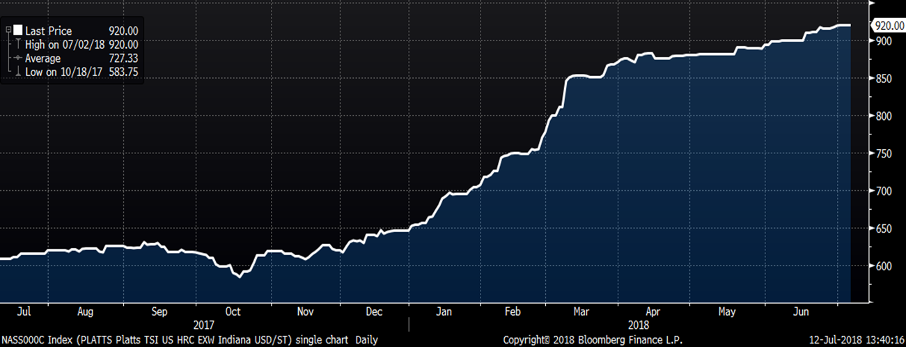 The Platts TSI Midwest HRC Index has now rallied 57.6 percent since October 2017.