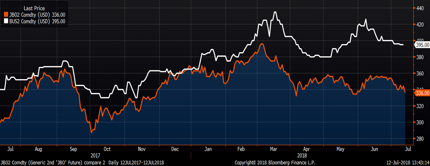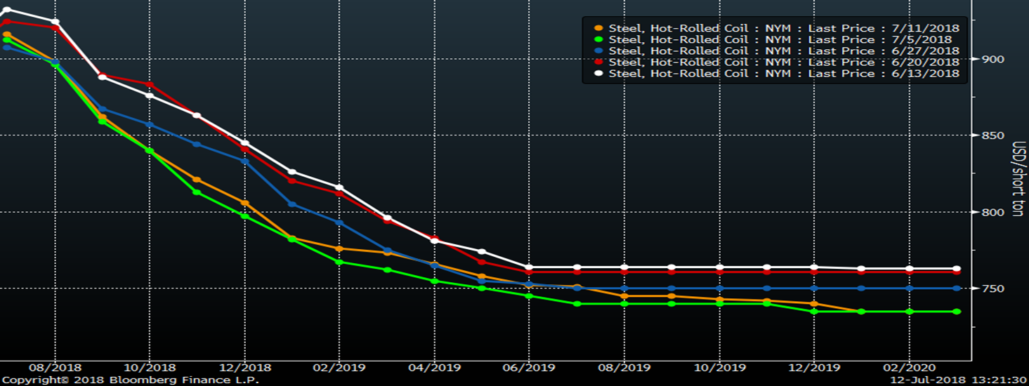 The CME Midwest HRC futures curve remains sharply backwardated with futures trading $100 or more below spot as early as the November 2018 future. Futures have deflated as much as $50 over the last month with buyers few and far between. However, buyers returning from holiday looked to lock in prices, especially in November, December and January, bidding them up $10 – $20 at the start of the week.