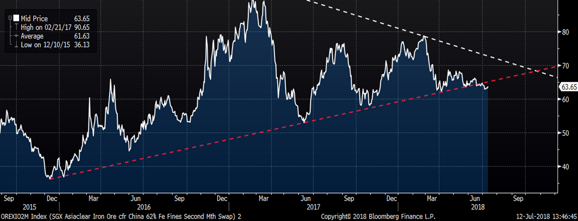 This article and the “Week Over Week” report have been following the “triangle” pattern in iron ore futures for some time. When a chart pattern forms a triangle, it is expected that trading of that product will see compressed volatility like a coiling spring, and whichever side of the triangle it breaks through, it will then break hard in that direction as the pent-up volatility is released. SGX iron ore futures have traded in a tight range since March and the 2nd month future has finally broken through one of the sides, below its long-term uptrend line that started in 2015. High volume is always an important factor, so watch for iron ore to start trading down on high volume. It could portend that a sharp sell-off is close.