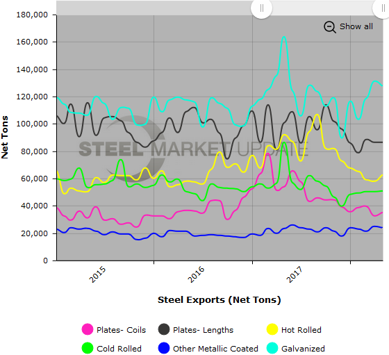 Galvanized exports fell 2.9 percent month over month to 127,571 tons. Compared to one year ago, May levels were down 22.0 percent.